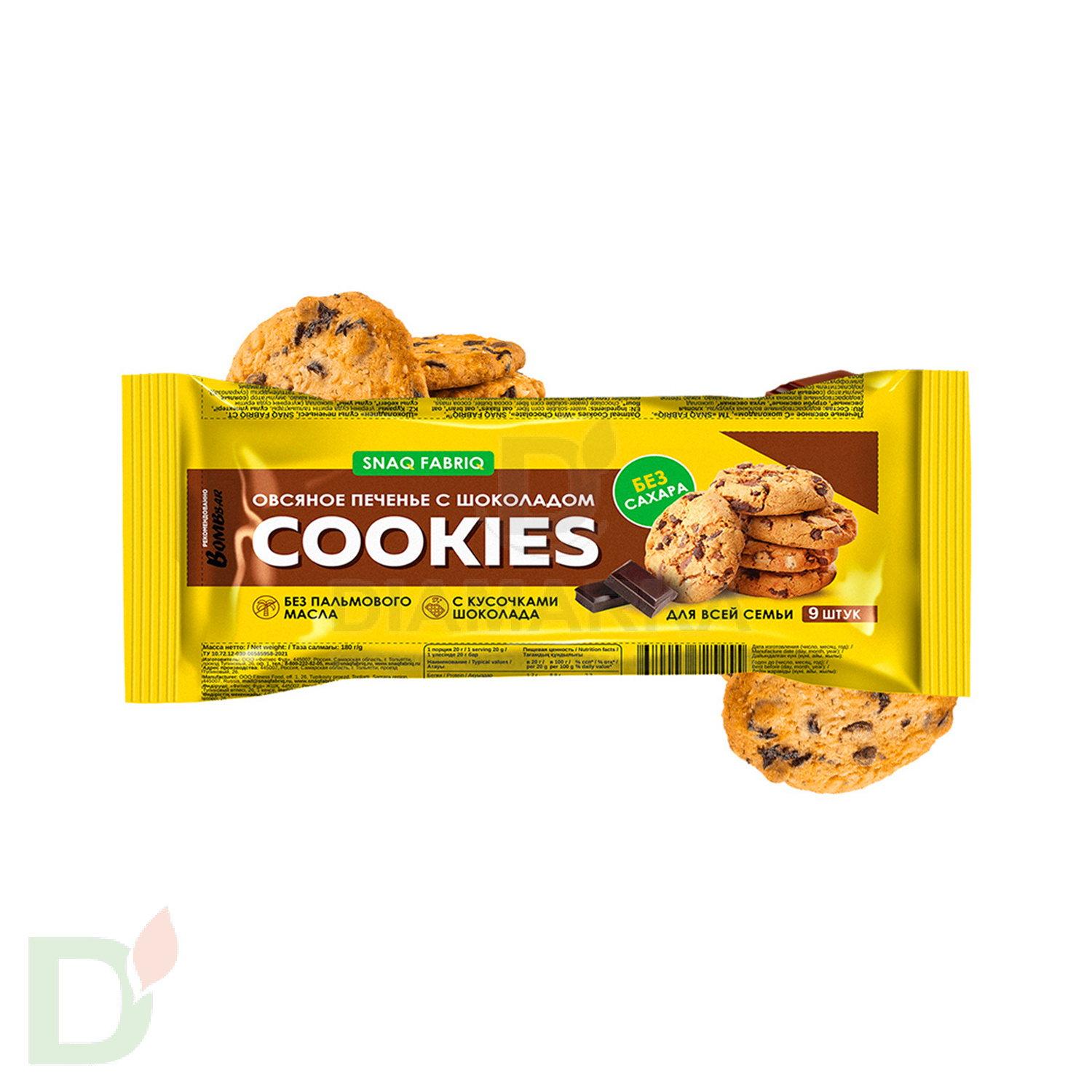 <h2>Хрустящее лакомство с пониженным содержанием углеводов</h2> Ароматное, хрустящее, рассыпчатое овсяное печенье - это что-то родом из детства! С молоком, чаем, кофе и даже всухомятку оно всегда заходило "на ура!". Однако классическое овсяное печенье - довольно таки углеводное удовольствие. На 100гр вкусняшки выходит примерно 65гр углеводов, а одно печенье обычно тянет на 1,5-2 ХЕ (хлебные единицы).<br> <br> <u>Овсяное печенье Snaq Fabriq - замечательная альтернатива привычным печенькам. И вот почему:</u><br> <u> </u> <ul> <li>печенья Snaq Fabriq содержат в 3 раза меньше углеводов</li> <li> в составе НЕТ сахара и его углеводных аналогов</li> <li> малый гликемический индекс</li> <li> польза для ЖКТ благодаря высокому содержанию клетчатки</li> </ul> <b>Одно печенье Snaq Fabriq весит 20гр и содержит 5,4гр углеводов!</b><br> <h2>Состав овсяного печенья с шоколадом</h2> водорастворимые волокна кукурузы, хлопья овсяные*, отруби овсяные*, мука овсяная*, шоколад (водорастворимые волокна кукурузы, масло какао, какао тёртое, эмульгатор (соевый лецитин), ароматизаторы натуральные, подсластитель (сукралоза)), инулин (пищевые волокна), олигофруктоза (пищевые волокна), масло кокосовое, семя льна, вода, эритрит (подсластитель), молоко сухое обезжиренное, продукты яичные (меланж яичный), соль, корица, агент влагоудерживающий (глицерин), ароматизаторы натуральные, регуляторы кислотности (гидрокарбонат натрия (сода пищевая), лимонная кислота), эмульгатор (соевый лецитин), антиокислитель (аскорбиновая кислота), подсластитель (сукралоза), консервант (сорбат калия).<br> <br> * содержит глютен<br> При чрезмерном употреблении может оказывать слабительное действие. Может содержать незначительное количество арахиса, миндаля, кешью, фундука, фисташки.<br> <h2>Пищевая и энергетическая ценность на 100 гр печенья</h2> <ul> <li>белки 8,8</li> <li> жиры 19,8</li> <li> углеводы 20,4</li> <li> клетчатка 27</li> <li> ккал 349</li> </ul> Вес одной печеньки - 20 гр<br> Масса нетто: 180 гр<br> <br> Срок годности 12 месяцев от даты производства