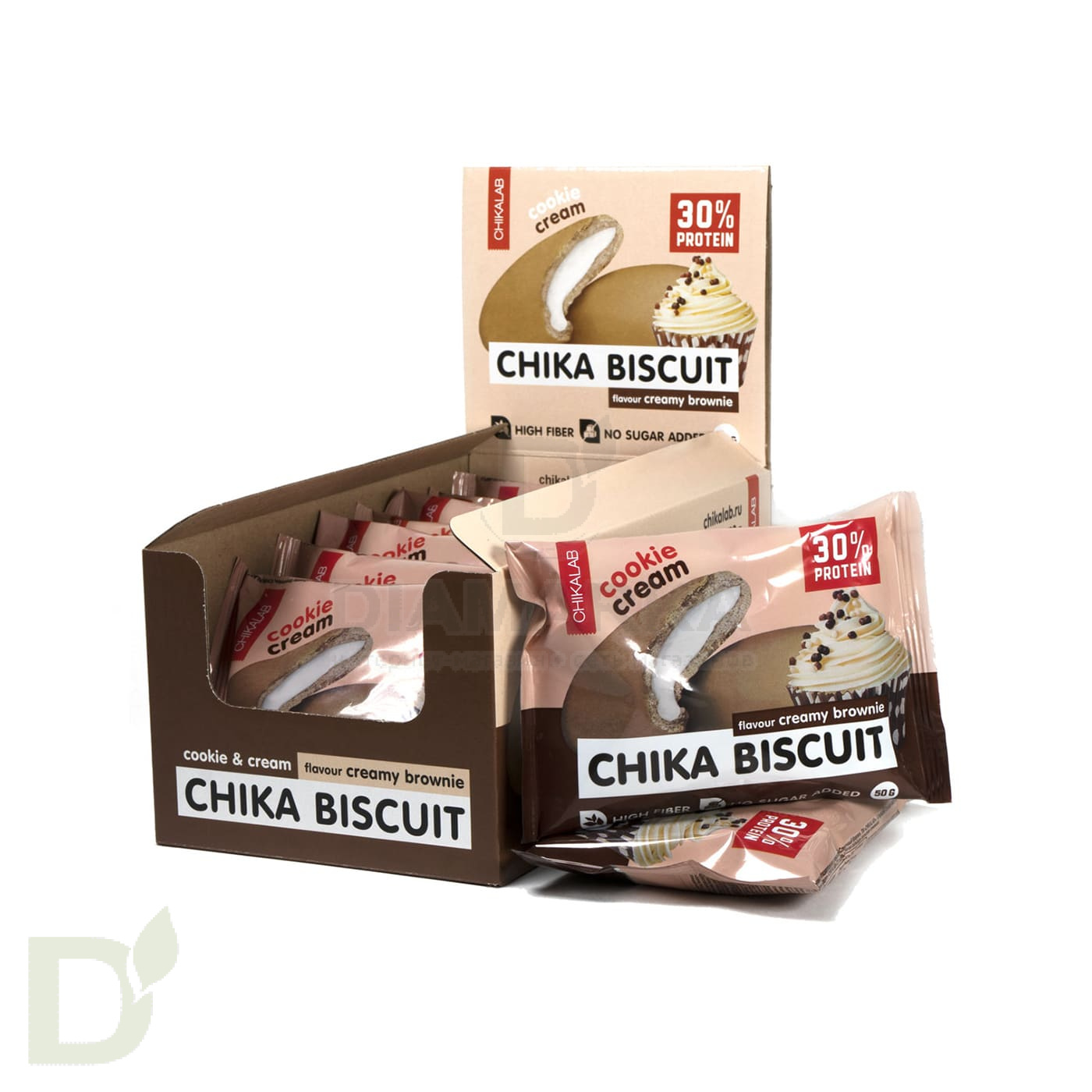 <h2>Печенье, на 30% состоящее из протеина</h2> Чика Бисквит на 30% состоит из молочного протеина. Это даже больше, чем в 100 граммовом стейке из говядины! Одной печеньки будет вполне достаточно, чтобы насытиться и бодро и активно продолжать свой день.<br> <h2>Десерт Chika Biscuit без сахара и муки</h2> Благодаря замене муки на протеин, а сахара на безуглеводный подсластитель (сукралоза) производителям удалось существенно снизить количество углеводов. Только представьте: в 100 граммах протеинового печенья содержится 4 грамма углеводов, в то время как в обычных их количество колеблется на отметке 65-70 грамм.<br> <br> Бисквит дополнительно обогащен пищевым волокном, про пользу которого вы уже наверняка наслышаны.<br> Такое печенье подойдет и для вечернего перекуса, и в качестве “загрузки” перед тренировкой, и для посиделок за чашечкой кофе.<br> <h2>Состав печенья Сливочный Брауни</h2> белковая смесь (концентрат сывороточного белка, концентрат молочного белка), водорастворимые волокна кукурузы, начинка сливочная (олигофруктоза (пищевые волокна из цикория), вода, изолят молочного белка, сыворотка сухая деминерализованная, масло кокосовое, агент влагоудерживающий (глицерин), загуститель (ксантановая камедь), ароматизаторы натуральные, антиокислитель (аскорбиновая кислота), соль, подсластитель (сукралоза)), масло кокосовое, вода, какао-порошок, агент влагоудерживающий (глицерин), продукты яичные (меланж яичный), соль, ароматизаторы натуральные, регуляторы кислотности (гидрокарбонат натрия (сода пищевая), лимонная кислота), эмульгатор (соевый лецитин), подсластитель (сукралоза), консервант (сорбат калия).<br> <h2>КБЖУ на 1 печенье / 50 грамм</h2> Белки - 15; Жиры - 8; Углеводы - 2,4; Пищевые волокна - 15; Ккал - 172<br> <br> Срок годности 6 месяцев
