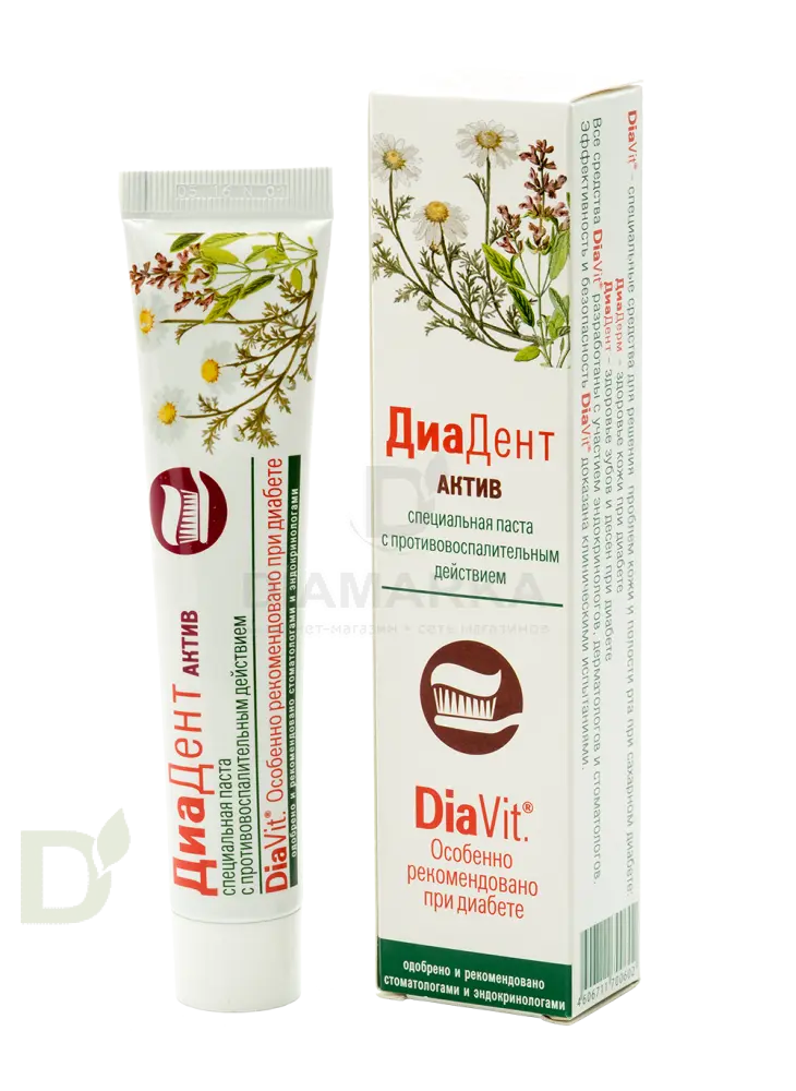 <h2>Ваша полость рта под защитой DiaVit</h2> Продукция ДиаВит нацелена на устранение и профилактику свойственных для диабетиков проблем кожи и полости рта. Кремы ДиаДерм эффективны в борьбе с сухостью, воспалениями, шелушениями, трещинками и опрелостями. Они отлично питают, восстанавливают и увлажняют кожу. В то время как линейка ДиаДент не просто борется с бактериями, живущими в полости рта, но и укрепляет десны, устраняет их кровоточивость, уменьшает проявления ксеростомии и освежает дыхание.<br> <h2>Линейка DiaDent обеспечит здоровье полости рта</h2> Средства с пометкой "Регуляр" идеальны для повседневного ухода за зубами и деснами, а продукты "Актив" рекомендуется в периоды обострений, когда десны воспаляются, болят и кровоточат.<br> <h2>Состав зубной пасты ДиаДент Актив</h2> вода, глицерин, диоксид кремния, полоксамер 188, ПЭГ-600, алюминия лактат, натрия лаурилсульфат, бетаин, гидроксиэтилцеллюлоза, титана диоксид, ароматизатор, натрия бикарбонат, натрия сахарин, альфа-бисаболол, хлоргексидина диглюконат (0,2%), сополимер ВП/ВА, ментол, масло эфирное чайного дерева, масло эфирное эвкалипта, тимол, натрия метилпарабен.<br> <br> <b>Использовать курсами не более 2 недель. С 18 лет.</b>