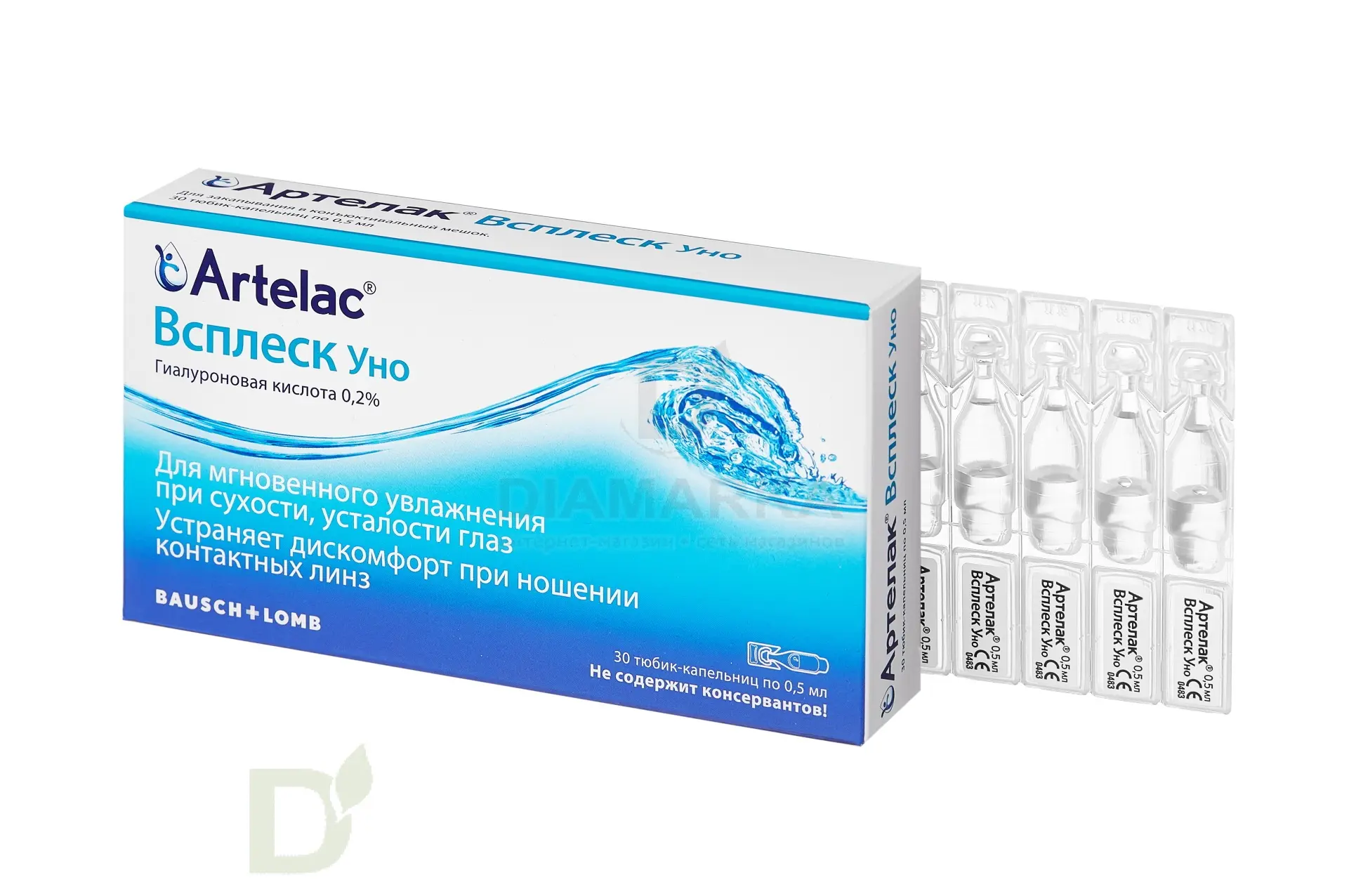 В составе средства Артелак Всплеск Уно гиалуроновая кислота, которая является естественным увлажняющим веществом. Капли помогают восстановить слезную пленку на роговице глаза, тем самым устранив чувство раздражения, сухости, ощущение инородного тела в глазу.Подходит для использования с линзами