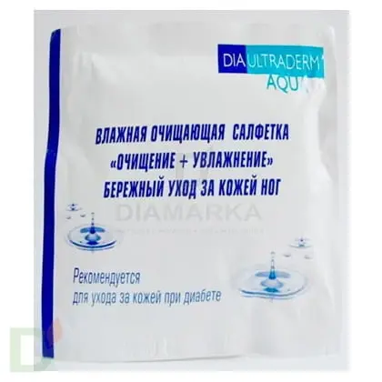 Гипоаллергенный антисептический состав лосьона обеспечивает безопасный эффективный очищающий уход за кожей ног, достаточный для последующего нанесения косметического крема на кожу. Эффективное очищение и увлажнение кожи салфеткой «Диаультрадерм Аква»  позволяет использовать крем для ног в качестве завершения комплекса гигиенического ухода, без дополнительных мероприятий. После использования, влажные салфетки «Диаультрадерм Аква» не оставляют липкого ощущения на коже.