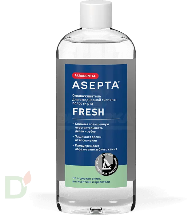 <h2>Эффективные зубные пасты, ополаскиватели и гели Асепта</h2> Здоровье зубов и десен во много зависит от качества ежедневной гигиены. Регулярное использование ПРАВИЛЬНЫХ средств поможет значительно снизить риски проблем полости рта. А это сохранит вам здоровье, нервы и бюджет (ведь лечение зубов - удовольствие очень дорогое!).<br> <br> <b>Средства Асепта эффективны при следующих проблемах полости рта:</b><br> <ul> <li>пародонтит</li> <li> гингивит</li> <li> стоматит</li> </ul> При использовании продуктов Асепта на постоянной основе вы гарантированно заметите значительное улучшение состояния полости рта!<br> <br> <b>Эффективность средств доказана клинически. Продукты обладают следующим эффектом</b><br> <ul> <li>снижают воспаления</li> <li> помогают бороться с кровоточивостью десен</li> <li> устраняют избыточный бактериальный рост в полости рта (причина развития кариеса, зубного налета и неприятного запаха)</li> <li> профилактируют развитие начальных и запущенных форм заболеваний полости рта</li> </ul> Используйте пасты и ополаскиватели Асепта дважды в день и со временем вы забудете о перечисленных проблемах. Их эффективность и безопасность подтверждена клиническими исследованиями в Центральном научно-исследовательском институте стоматологии и челюстно-лицевой хирургии<br> <br> <h3>Ополаскиватель полости рта для ежедневного применения</h3> Асепта Фреш - комплексный ополаскиватель для ежедневной гигиены полости рта. Обладает следующим действием:<br> <ul> <li>снижает повышенную чувствительность зубов</li> <li> защищает эмаль от воздействия кислот и бактерий</li> <li> предупреждает образование зубного налета и камня</li> <li> защищает от воспалений и кровоточивости</li> <li> замедляет бактериальный рост в полости рта</li> </ul> <b>Используйте ополаскиватель 2-3 раза в день после еды.</b><br>