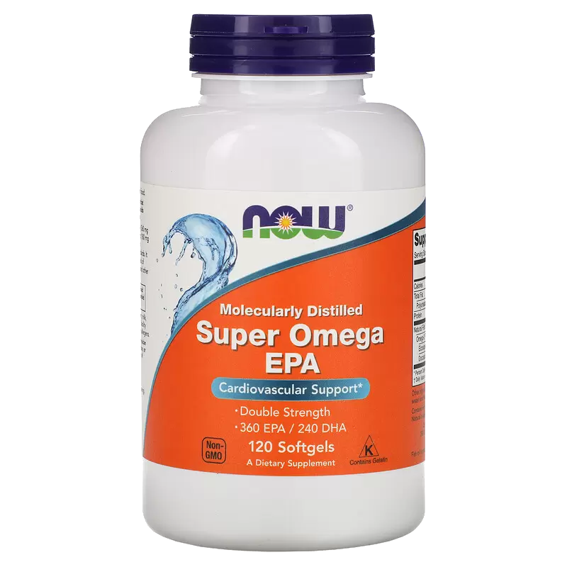 <h2>Натуральные и эффективные биологически активные добавки</h2> Биологические активные добавки к пище - важная составляющая рациона современного человека. Ведь получить необходимое количество полезных веществ из пищи - практически нереально. Мы попросту столько не едим. И тогда на помощь приходят БАДы. Порой одной таблетки мультивитаминного комплекса достаточно, чтобы покрыть потребность организма во всех необходимых витаминах и минералах.<br> <br> Now Foods - американский бренд БАДов, витаминов, минералов и комплексных добавок для поддержания и укрепления здоровья. Производится с 1968 года. Ассортимент бренда насчитывает БОЛЕЕ 1000 единиц продукции: от моновитаминов до косметики.<br> <br> Нормальный витаминно-минеральный баланс организма - это крепкий иммунитет, хорошее самочувствия, свежий и бодрый внешний вид, силы на борьбу со стрессами.<br> <br> <h3>Показания к применению и фармакологическое действие</h3> Поддержание работы сердечно-сосудистой системы<br> <h3>Состав комплекса</h3> Super Omega EPA NOW содержит в два раза больше EPA (360 мг на капсулу), чем в добавке со стандартной дозировкой. Этот натуральный концентрат рыбьего жира производится в соответствии со строгими стандартами контроля качества. Он проверен на отсутствие потенциально вредных уровней загрязняющих веществ, таких как ПХД, диоксины, ртуть и другие тяжелые металлы.<br> <h4>Противопоказания к применению</h4> Индивидуальная непереносимость. <br> Беременным и кормящим женщинам необходимо проконсультироваться с врачом.<br> <h4>Способ применения и дозировка</h4> Принимать по 2 капсулы в день с едой.<br> <br> 120 капсул в упаковке.<br> <br> БАД. Не является лекарством